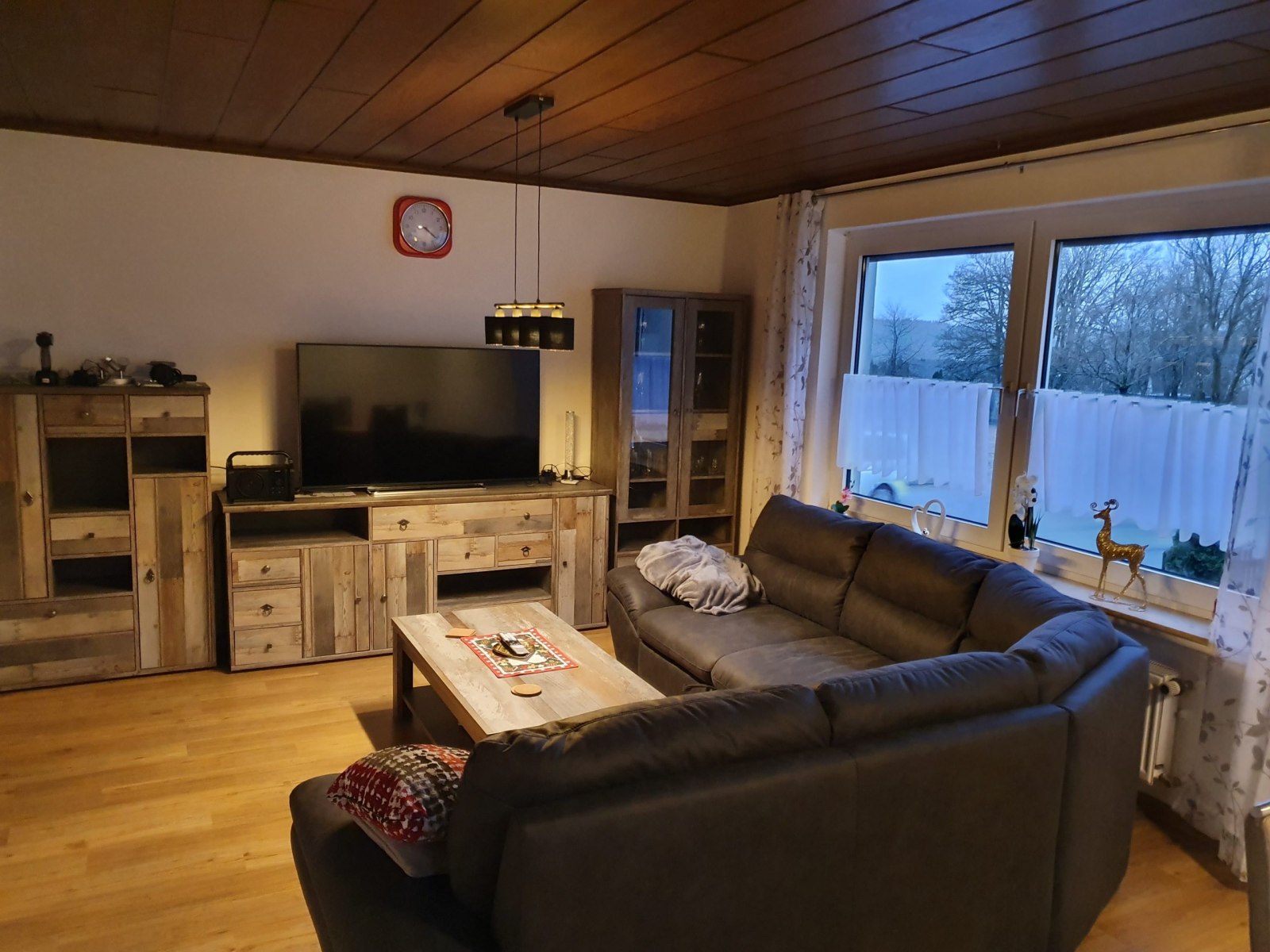 - Wohnzimmer mit großem Flachbildfernseher und Couch zum Ausziehen, auf der zwei Personen schlafen können