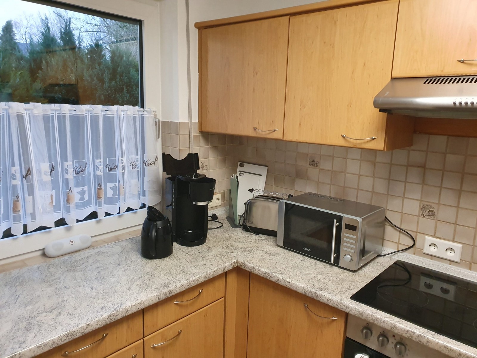 - Küche mit Ceran-Kochfeld, Backofen, Mikrowelle, Toaster, Kaffeemaschine sowie Geschirr; großer Esstisch direkt neben der Küche.