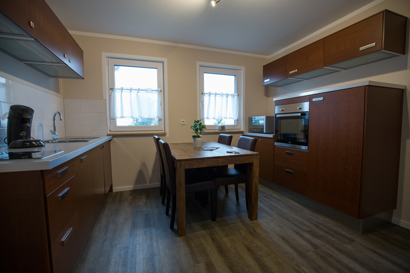Ausstattung der Küche: Kühlschrank mit Gefrierfach, Mikrowelle mit Grill und Umluft, Backofen, Induktionskochfeld, Spülmaschine, Waschmaschine mit Kondenstrockner