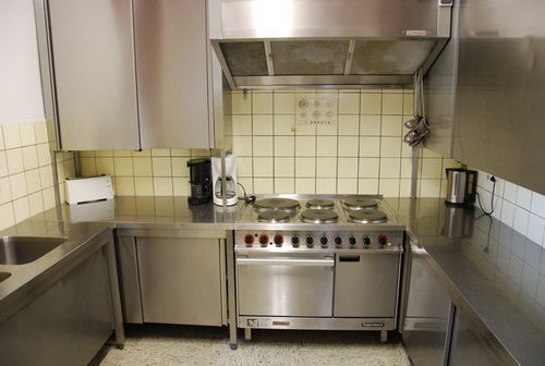 Die vorhandene Edelstahlküche ist mit ausreichendem Inventar für den Selbstversorgerbetrieb ausgestattet.